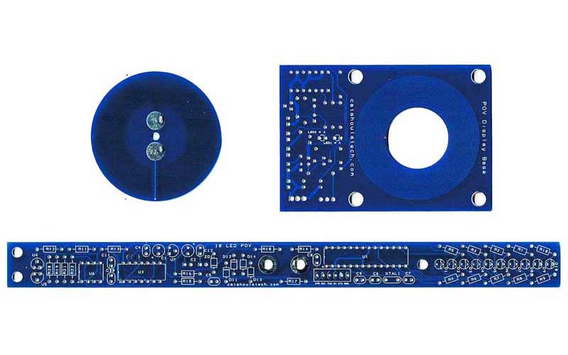 The POV base PCB takes in 9-12VDC, mounts on an inexpensive standard 60x60mm PC fan, and contains a low cost switching supply driver for an air-core PCB transformer primary to supply power to the POV spinning boards. The round PCB is the transformer secondary that supplies power to the third long and narrow PCB for the POV display. The PC fan is used to spin the secondary transformer and POV display board. There are 2 IR LEDs on the base that couple to 2 phototransistors on the POV board. The first LED is on all the time and is used to provide a position reference for the spinning board. The second LED can be controlled from a pushbutton for purposes such as setting the time or changing the display modes if desired.