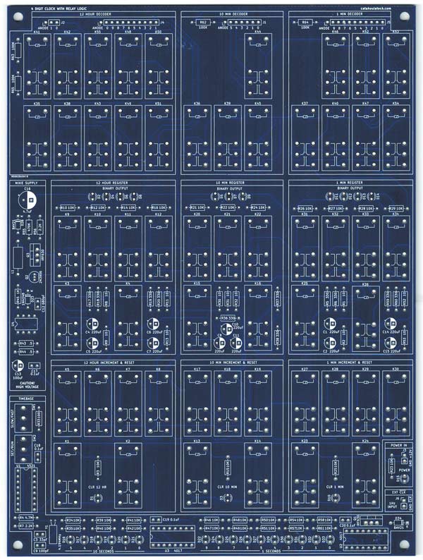 Show off your retro technology nerdiness with a single board 4-digit 12-hour nixie clock running off DPDT relay logic ready to power your choice of nixies or similar decimal display! The design uses a solid-state timebase and seconds counter for practical purposes so there is no constant clicking noise every second, but you do have the option to wire in an external 1Hz timebase from any circuit of your preference including more relay counters, a mechanical timer, or even vacuum tube based circuitry.