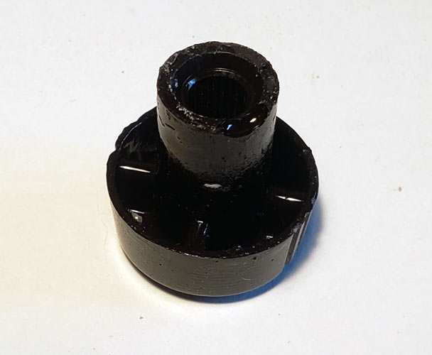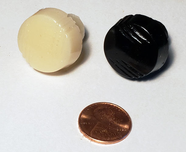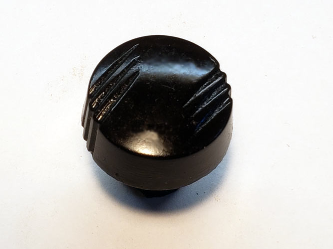 New reproduction resin knob in black, dark walnut or ivory for many 1937-40 Belmont-made bakelite and plaskon tabletop radios including Airline, Delco, Freshman, Goodyear and Truetone. These knobs while the same in appearance have variations in shaft mounting (1/2" stem, 1/4" stem, splined or D-type shaft) so please take care to specify color, shaft type and length when placing order.