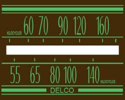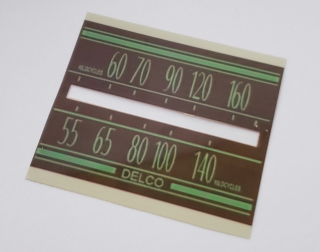 New reproduction dial scale for 1938 Delco R-1134 and R-1135 radio models. Color laser printed on a transparency with painted backing.